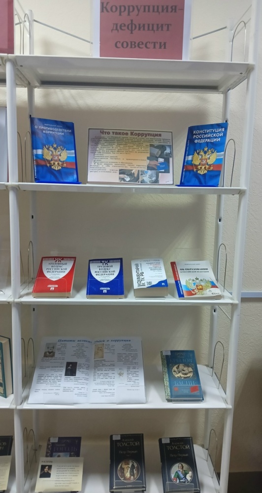 В преддверии Международного дня борьбы с коррупцией, который отмечается ежегодно 9 декабря, в библиотеке Института нефти и технологий оформлена книжная выставка "Коррупция – дефицит совести". Это название очень точно отражает суть проблемы. Коррупция – это не просто нарушение закона, это, прежде всего отсутствие моральных ориентиров, это потеря совести.